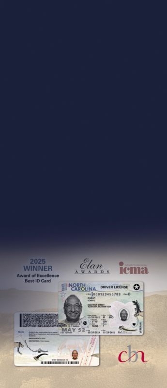 In 2025, CBN was honoured with the ICMA Élan Award for Best ID Card for our work on the North Carolina Driver’s License. The award was presented at the 35th Anniversary ICMA Card Expo Gala in Orlando, Florida, marking CBN’s fifth consecutive win and eleventh overall Élan Award in this category.